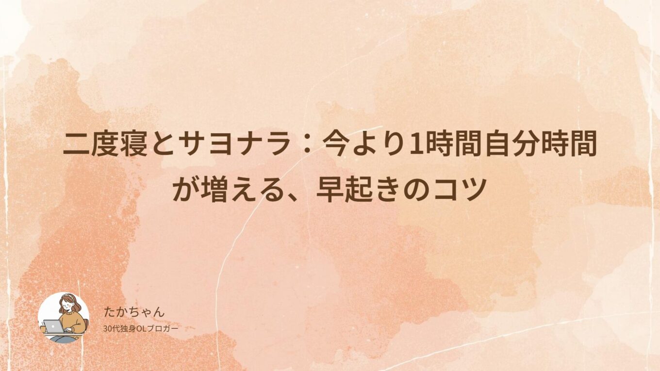 当サイトの人気記事Popular Post 【今日からできる】寝ても眠い社会人必見!睡眠改善のコツ4選と具体的なステップを解説 1 views 二度寝とサヨナラ:今より1時間自分時間が増える、早起きのコツ 1 views 新着記事New Post 【今日からできる】寝ても眠い社会人必見!睡眠改善のコツ4選と具体的なステップを解説 2026.02.16 Uncategorized 二度寝とサヨナラ:今より1時間自分時間が増える、早起きのコツ 2026.02.08 暮らし Uncategorized 暮らし たかちゃん30代独身OLブロガーProfileQOL=クオリティオブライフ あらゆる面での生活の質を上げるお手伝いをするブログです。 1日10分読んで、ちょっぴりHAPPYになれますように・・・!プロフィールを読むXInstagramYouTube