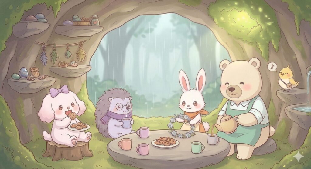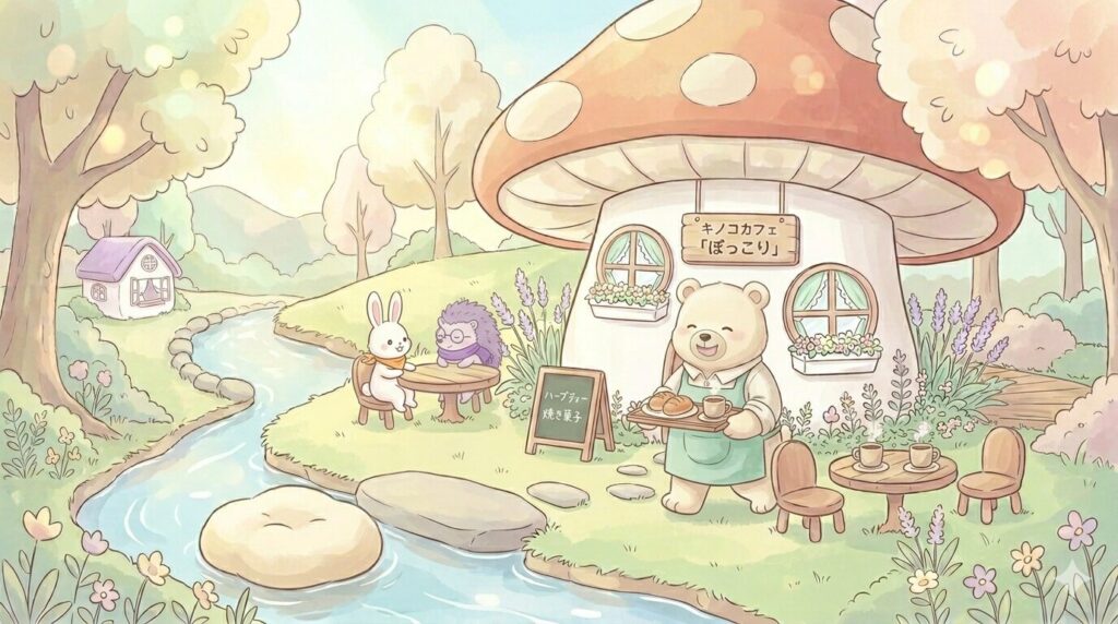 大きなきのこをくりぬいて作られた、森の中心にあるカフェ。毎朝焼きたてパンの香りが漂います。もちくまのハーブティーが絶品で、悩んでいるときも、うれしいときも、「まあまあ、お茶でも飲もう」と言ってくれる場所。